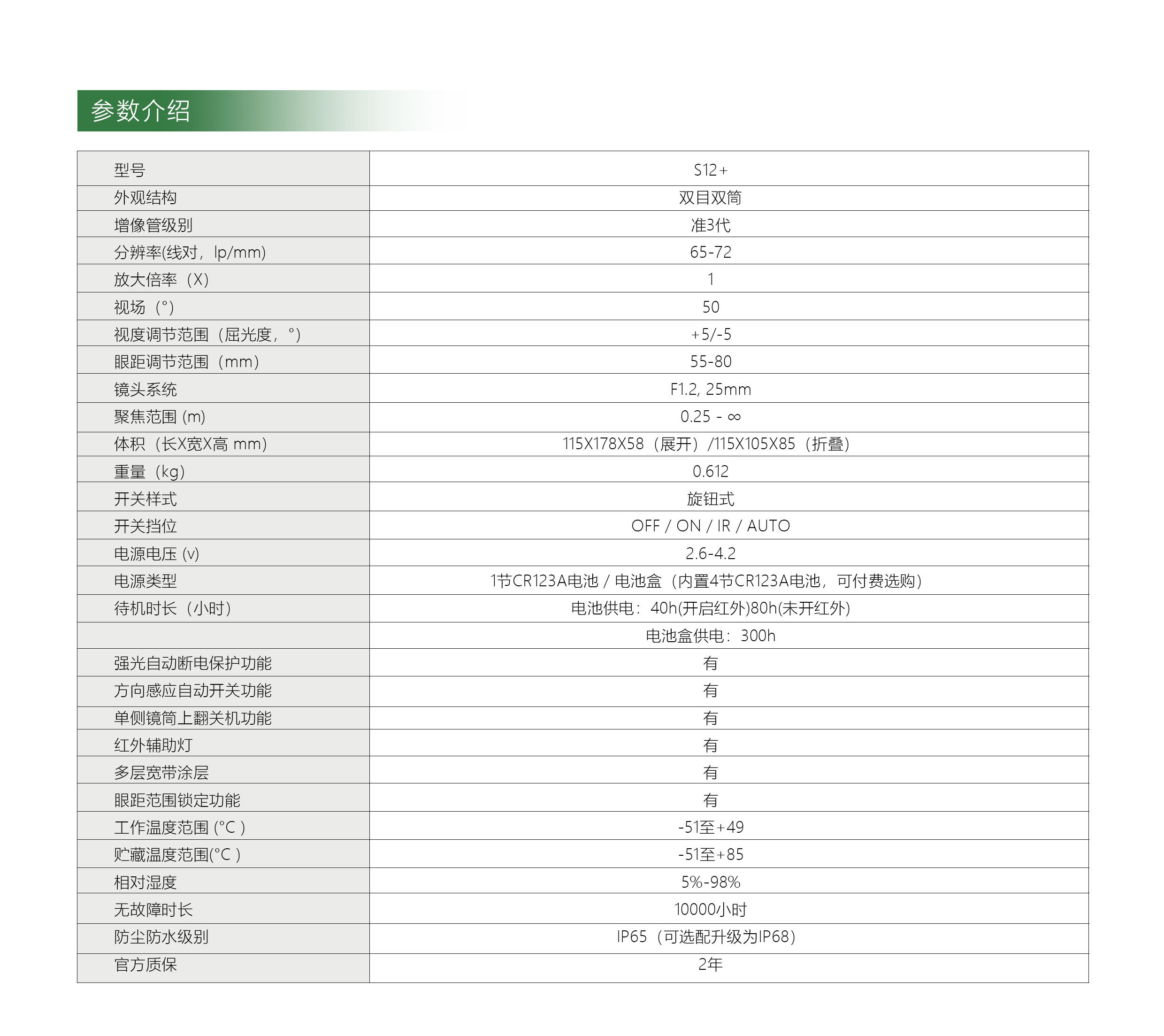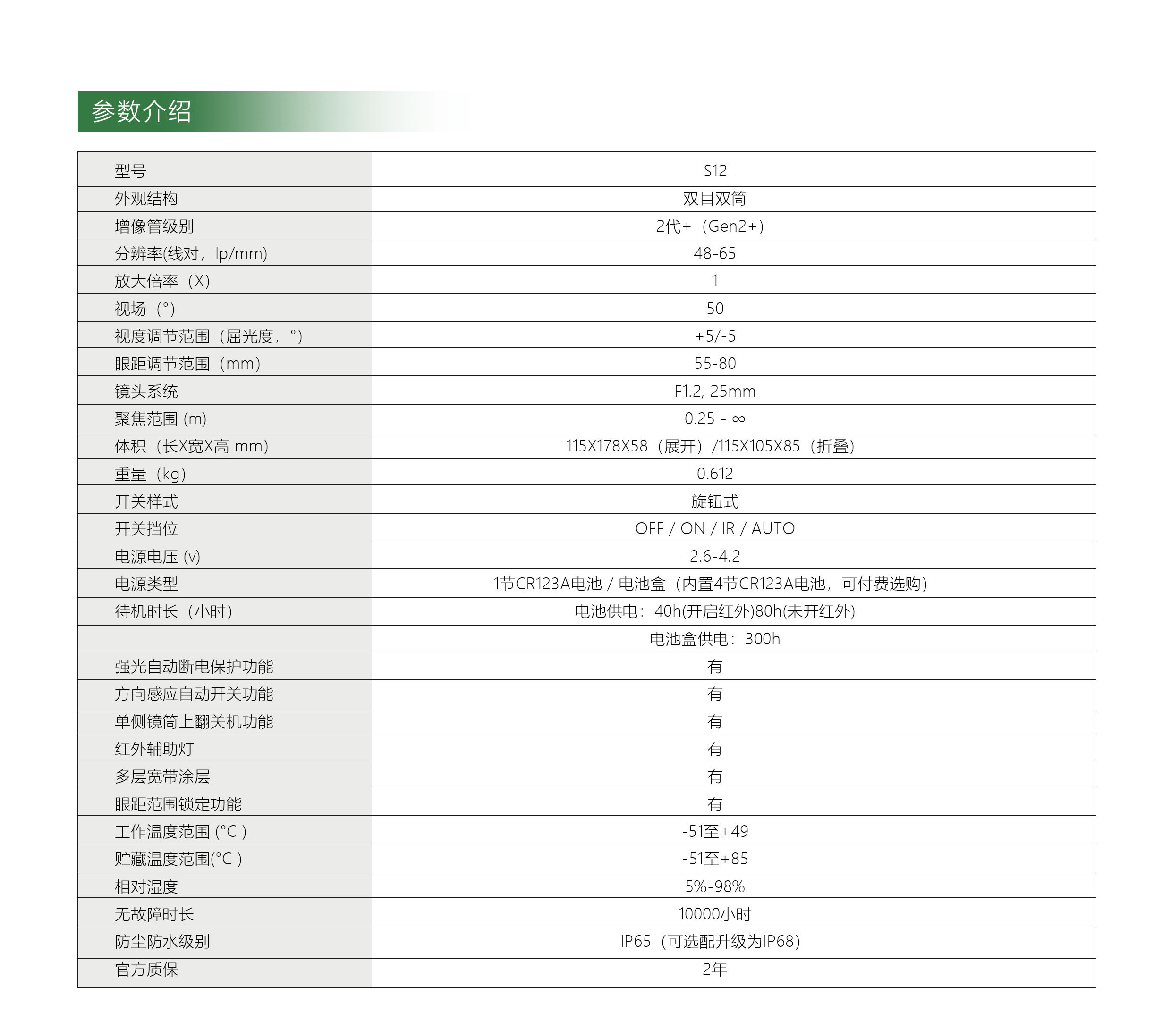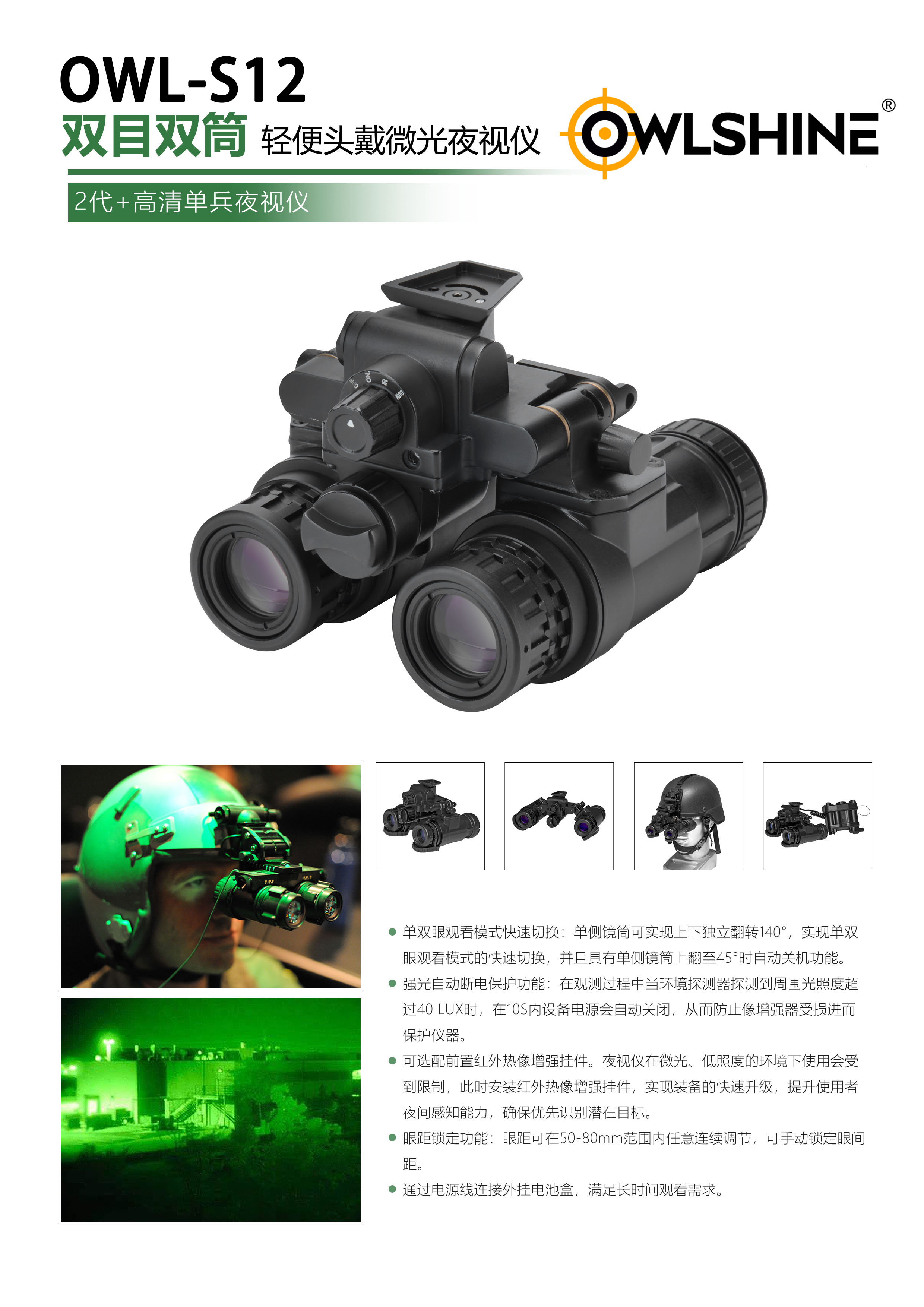 OWL-S12(采用二代+像增强管)/S12+(采用准三代像增强管),拥有眼距锁定功能,单双眼观看模式快速切换,强光自动断电保护功能,方向感应自动开关。