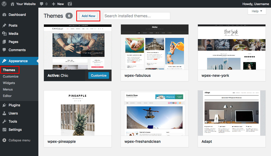 To install a new theme, log in to your WordPress site and navigate to Appearance > Themes > Add New Theme. From here, you can browse the free themes available through WordPress.org, or you can click the Upload Theme button to upload a zip file of a theme you've downloaded or purchased elsewhere.