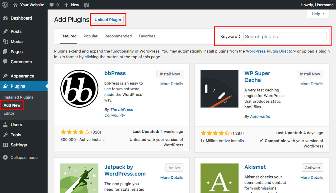 Installing plugins is very simple. From your WordPress dashboard go to Plugins > Add New. From here, you can use the search function to find free plugins to install from WordPress.org, or you can click the Upload Plugin button to upload a zip file of a plugin you've purchased or downloaded from a third party.