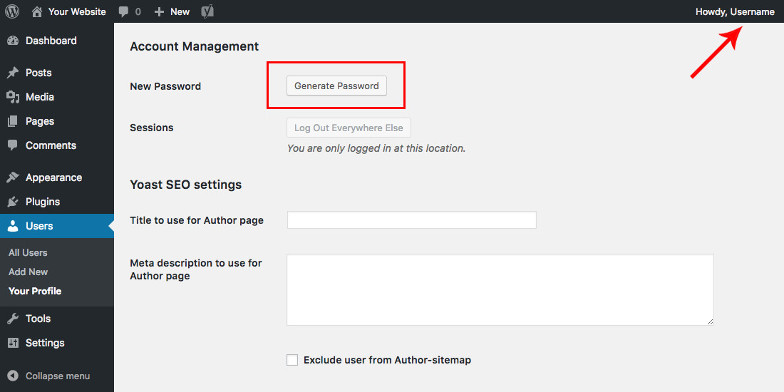如果您已经登录到您的 WordPress 帐户,请单击屏幕右上角管理工具栏中的用户名(如果您的管理栏被禁用,则只需通过仪表板转到用户>您的用户名)。
