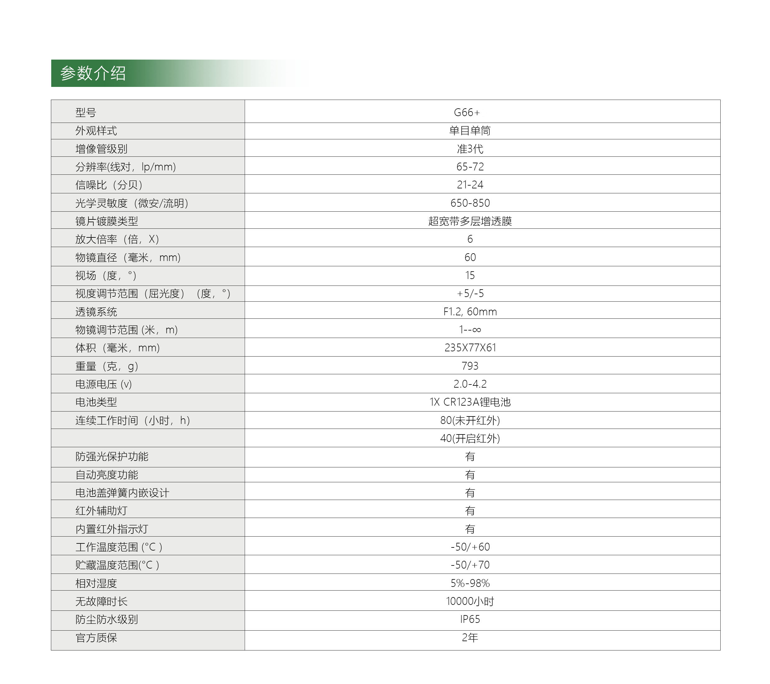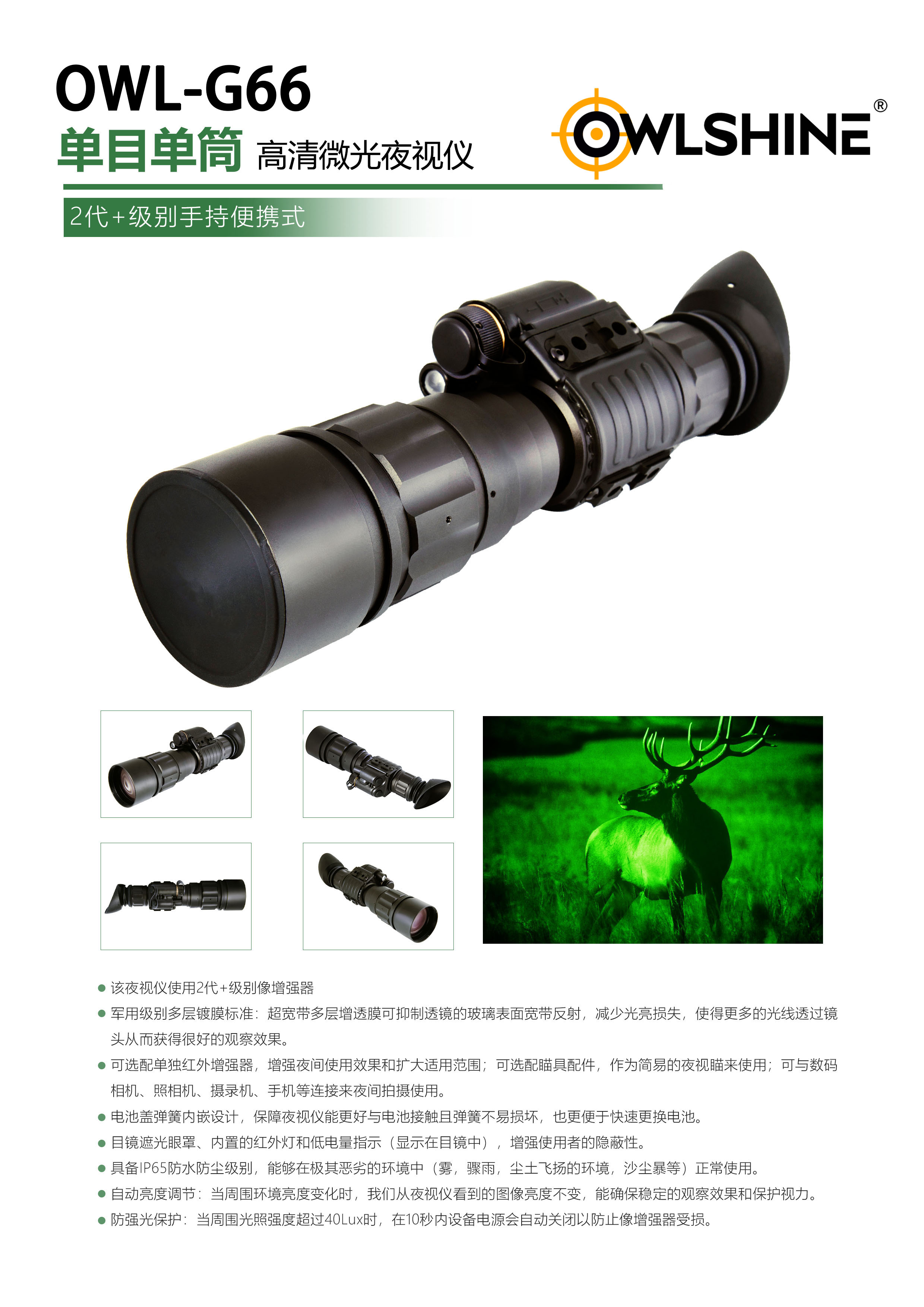 OWL-G66采用2代增强管/G66+采用准3代增强管,军用级别多层镀膜标准:超宽带多层增透膜可抑制透镜的玻璃表面宽带反射,减少光亮损失。可选配单独红外增强器,增强夜间使用效果和扩大适用范围;可选配瞄具配件,作为简易的夜视瞄来使用;可与数码相机、照相机、摄录机、手机等连接来夜间拍摄使用。具备IP65防水防尘级别,能够在极其恶劣的环境中(雾,骤雨,尘土飞扬的环境,沙尘暴等)正常使用。自动亮度调节,防强光保护等功能